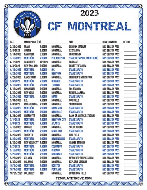 Jadwal CF Montreal dapat digunakan untuk merencanakan kehadiran di pertandingan. Penggemar dapat memilih pertandingan yang ingin mereka hadiri berdasarkan tanggal, waktu, dan lawan.